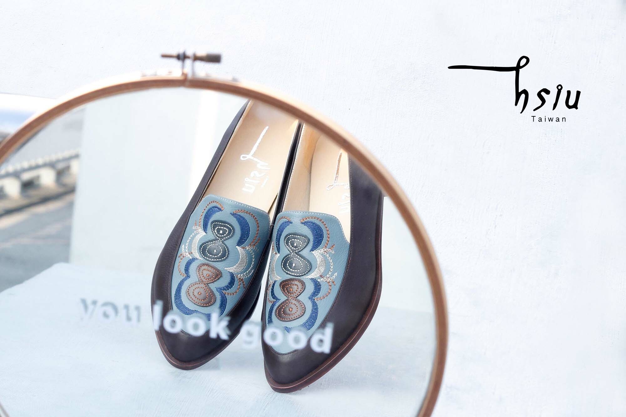 蝴蝶造型皮革與刺繡結合在鞋面上