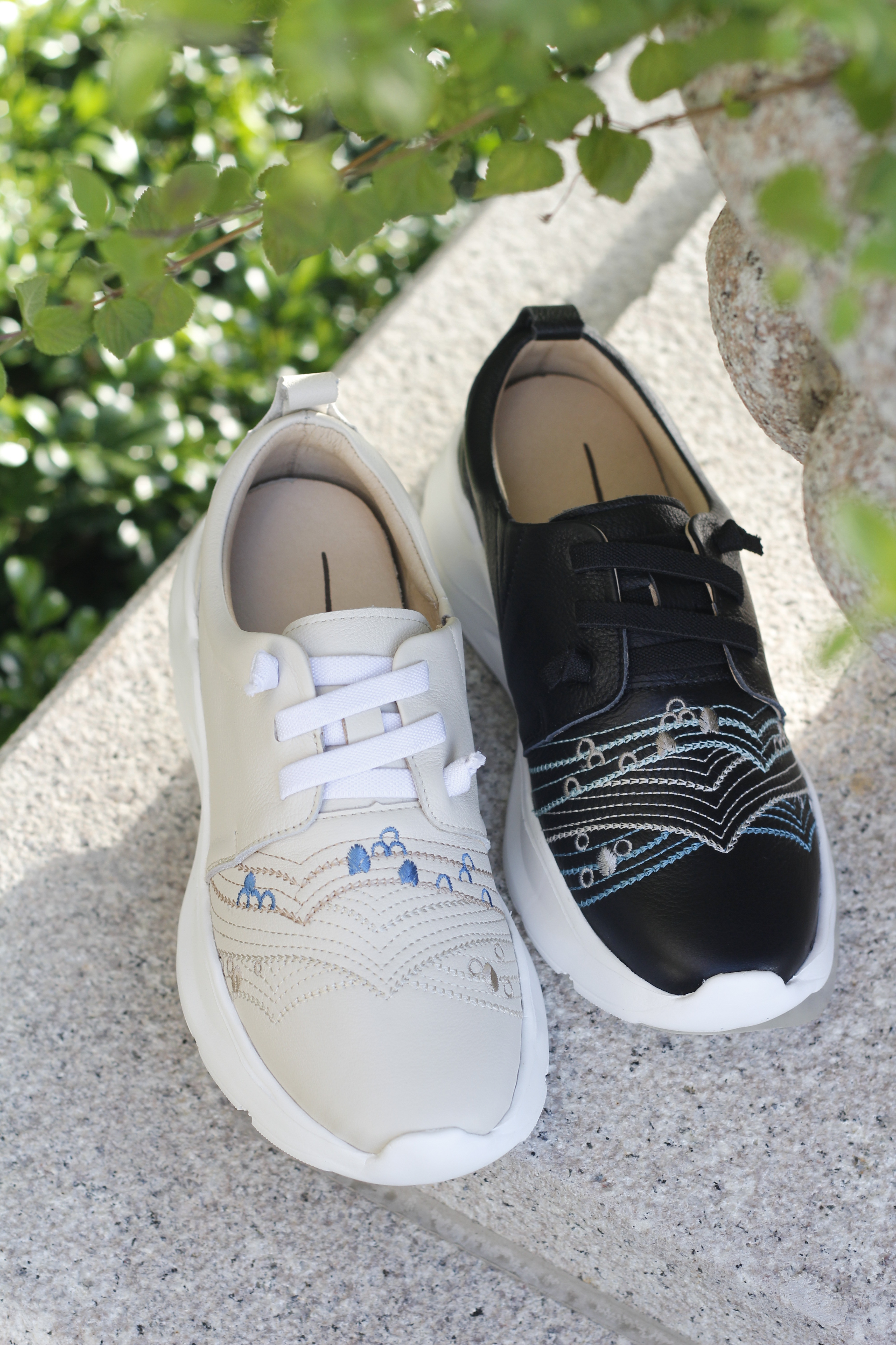 透過虛實繡線呈現於鞋面之上